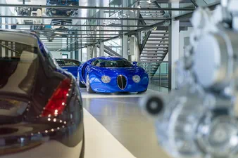 Entworfen von Giorgetto Giugiaro, verkörpert der Bugatti EB 118 (1998) mit seinem 18-Zylinder-Motor die erste konkrete Vision für die „Wiederbelebung“ der Marke im Volkswagen Konzern. Ergänzend dazu wird der Motor des EB 218 gezeigt – er bildete die technische Grundlage für die späteren Serienmodelle.