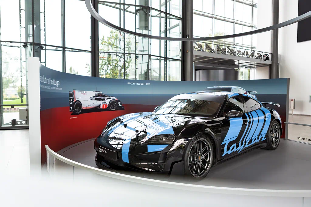 Das zweite Exponat ist ein dreifacher Rekordhalter: Der Taycan Turbo GT mit Weissach-Paket sicherte sich 2024 auf dem Weathertec Raceway von Laguna Seca in Kalifornien den Titel als schnellstes elektrisches Serienauto. Mit weiteren Rekorden auf der Nürburgring-Nordschleife und dem Shanghai International Circuit konnten die Entwicklungsfahrer von Porsche auf drei ganz unterschiedlichen Strecken und auf drei Kontinenten zeigen, wie stimmig das Gesamtpaket des Taycan Turbo GT ist. Die Sportlimousine ist mit maximaler Traktion und Leistung konsequent für die Rundstrecke ausgelegt: Mehr als 1.100 PS beschleunigen das Fahrzeug auf über 300 km/h. Aus Sicherheitsgründen ist in dem Rekordauto eine komplette Sicherheitsausstattung mit Käfig und Rennschalensitz verbaut; etliche Carbon-Teile und der Verzicht auf die Rücksitzbank verbessern das Leistungsgewicht.