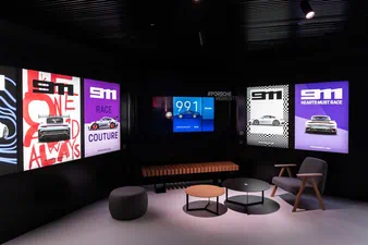 Der Epilograum im Porsche Pavillon bietet Besucherinnen und Besuchern ab sofort eine neue Ausstellungs-Erfahrung. Im Zusammenspiel von analoger und digitaler Kunst wird Raum für Entdeckungen und Interaktionen geschaffen. Das automobile Highlight der Ausstellung, ein 911 in Luganoblau, wird von verschiedenen Postern rund um die Sportwagen-Ikone 911 flankiert. Die großformatigen Poster zeigen die beeindruckende Vielfalt der Baureihe 911 und ermöglichen darüber hinaus eine besondere 3D-Erfahrung. Sobald die Smartphones auf die Plakate gerichtet werden, entfaltet sich eine zusätzliche, digitale Ebene: Motive beginnen sich zu bewegen, Objekte werden dreidimensional oder Informationslayer kommen hinzu. Der 911 in Luganoblau ist ebenfalls wie ein Poster inszeniert – und schafft so eine weitere Verbindung aus Technik und Kunst, die den Raum durchbricht. Eine gemütliche Sitzlounge lädt die Gäste dazu ein, Platz zu nehmen, sich auszutauschen und eigene Poster zu generieren.